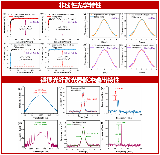 图2.Sb3+掺杂Cs3Cu2I5SA的非线性光学特性以及锁模脉冲输出特性