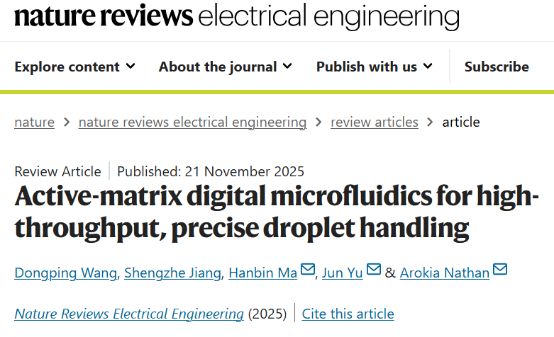 山大首篇!Arokia Nathan院士、于俊教授团队在有源矩阵数字微流控领域发表《Nature Reviews Electrical Engineering》论文