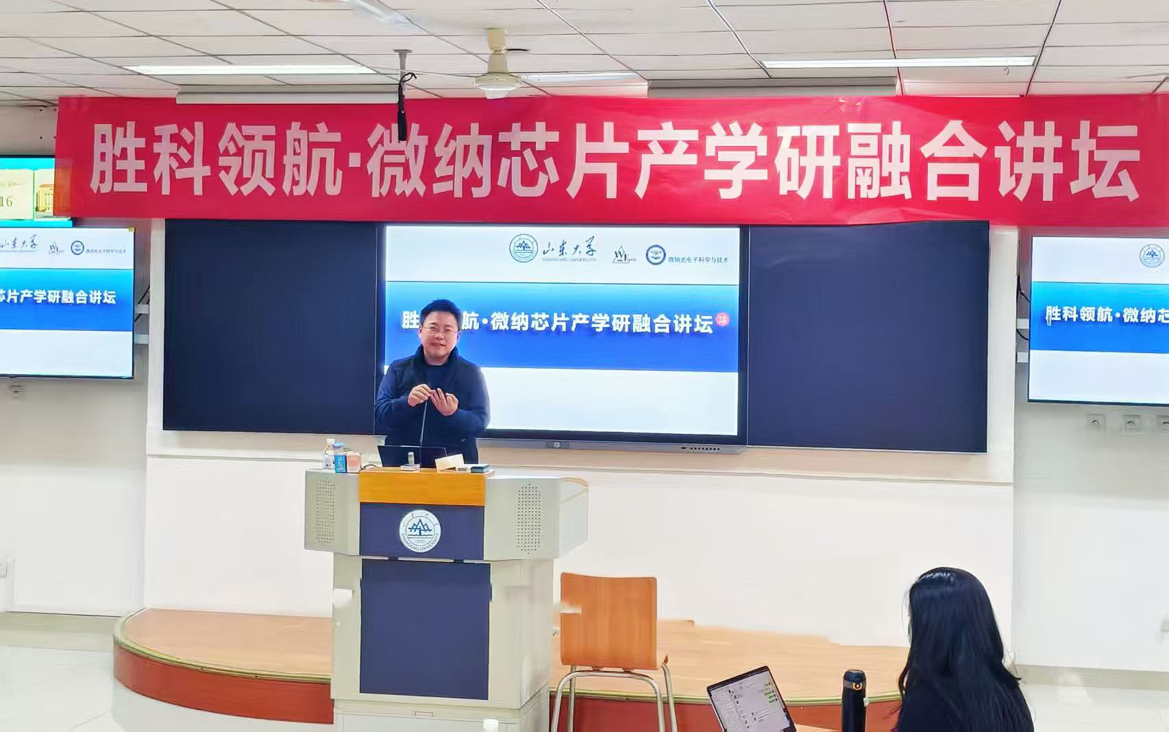 12月9日,信息学院“胜科领航・微纳芯片产学研融合讲坛”在山东大学青岛校区振声苑举行。胜科纳米(苏州)股份有限公司监事会主席、研发部负责人乔明胜作专题分享。讲坛由学院微纳光电子科学与技术实验班主办,学院陶继方教授主持,微纳班学生共同参与。