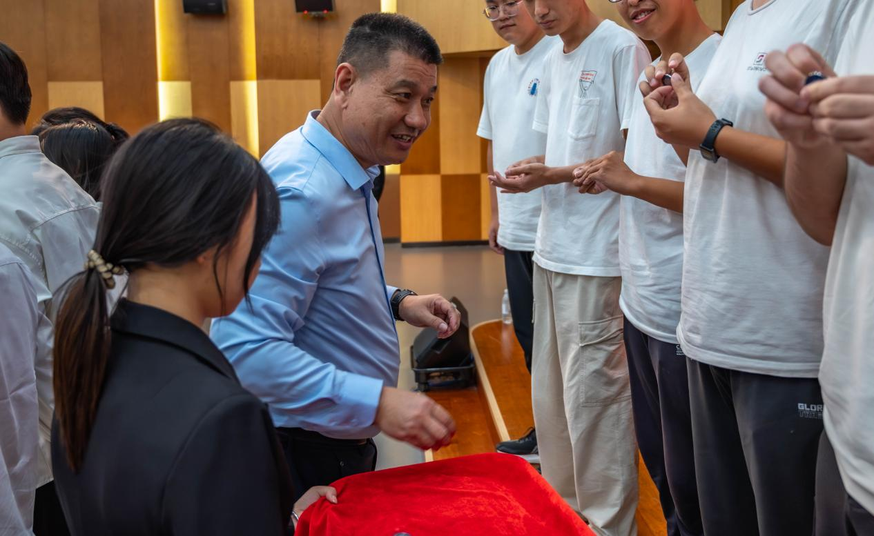 致辞结束后,现场举行了庄重的新生佩徽仪式。李德春为每位精英班成员佩戴班徽,这枚徽章不仅是精英班身份的象征,更承载着沉甸甸的责任与期望。佩戴徽章的新生们身姿挺拔,脸上洋溢着加入精英班的自豪,眼神中充满对未来学习生活的憧憬。