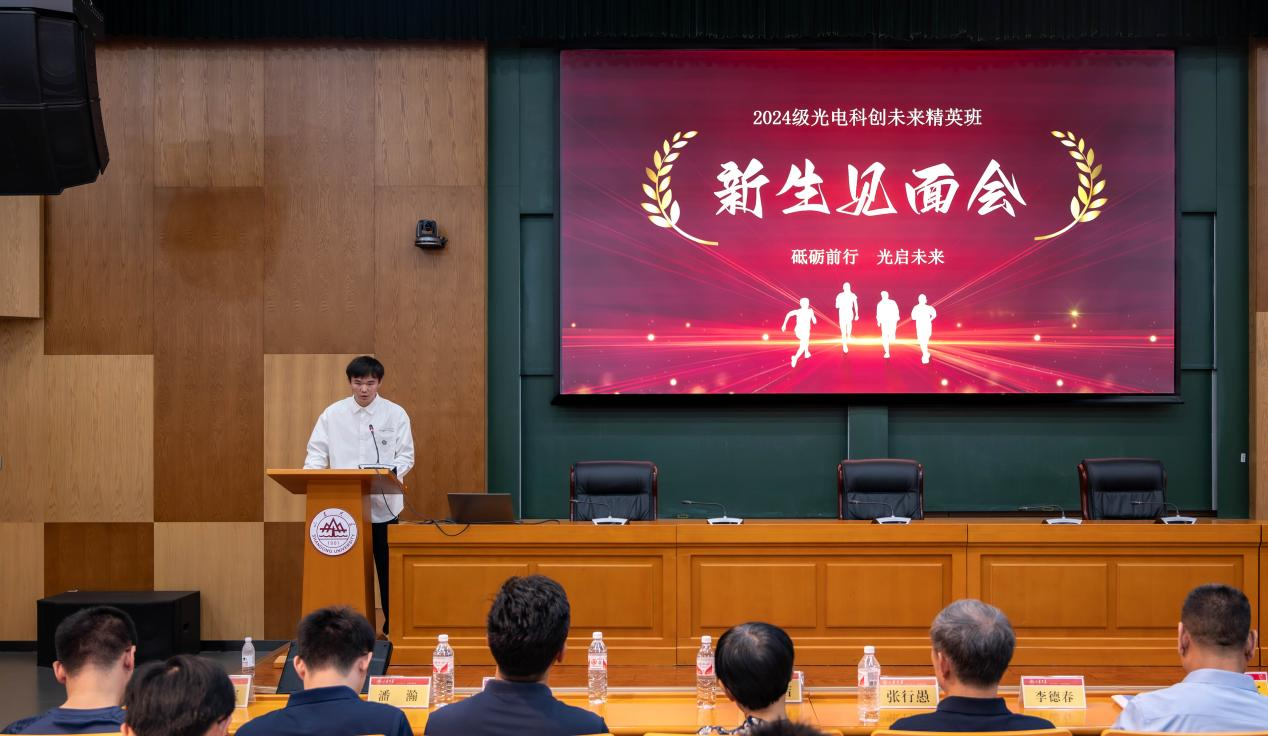 随后,新生代表蒋嘉琪上台发言。他分享了加入“光创大家庭”的激动心情,他承诺,在未来的学习生活中,认真钻研专业知识,积极投身科研实践,努力在光电领域实现自我成长与突破,为行业发展贡献青春力量。