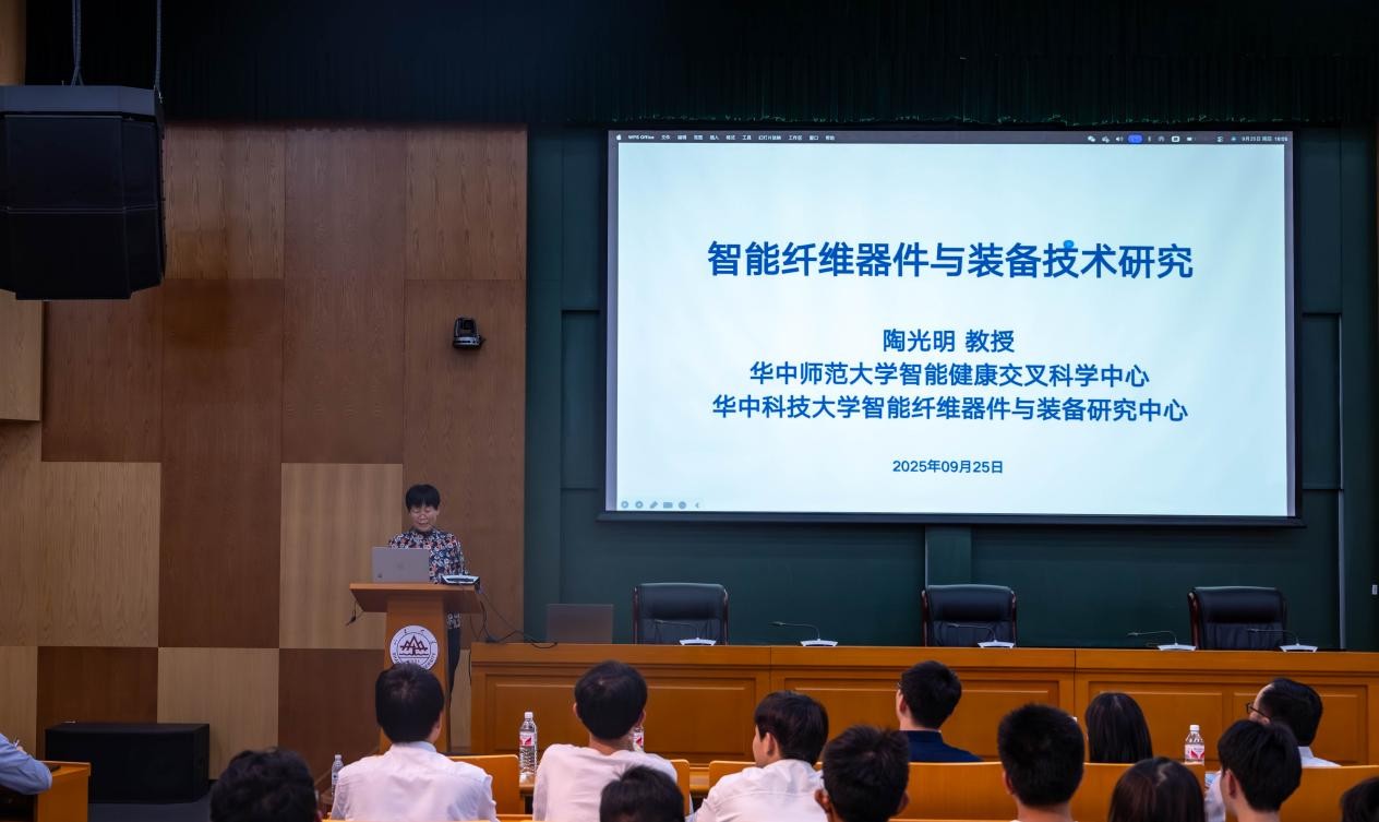 陶光明教授带来题为《智能纤维器件与装备技术研究》的前沿报告。陶教授结合团队前期的科研成果,系统展示了智能健康交叉科学领域的最新突破。他介绍了通过纤维内纳米颗粒与纤维间微米结构的协同设计,实现宽光谱光热的精准调控,以及该技术在汽车内部、人体皮肤表面降温场景中的实践效果。此外,陶教授介绍了无感化技术的研发思路——从提升电子织物交互精度,到构建“传感-传输-处理”一体化的生命体征监测体系,让长期、实时的健康数据采集成为可能。他勉励青年学子:“光学技术的应用远不止于成像与通信,将光学功能融入纤维,让健康监测可穿戴、装备更智能,这是光学人的新赛道。希望大家能怀揣着对科学的热爱与对未知的好奇,勇于探索,敢于创新。”
