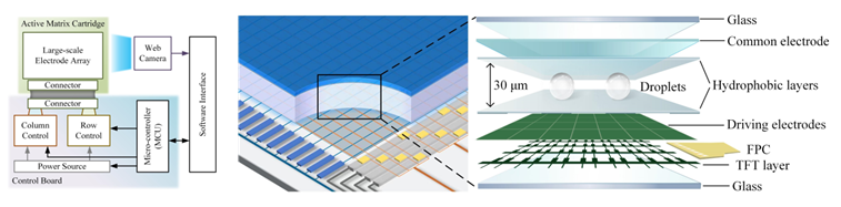 基于介电润湿(EWOD)效应的有源矩阵数字微流控(AM-DMF)技术,为液体生物样本的高通量操控提供了自动化水平更高、集成性更强的解决方案。AM-DMF通过采用薄膜晶体管(TFT)有源矩阵背板,克服了传统无源矩阵架构的可扩展性限制,能够同时并行操控数万个微液滴。然而,随着生物医学实验对通量和集成度要求的不断提高,AM-DMF系统也面临新的挑战:阵列规模扩大带来的薄膜晶体管泄漏电流问题,可能影响液滴操控的稳定性;系统需集成实时液滴位置传感功能,以实现闭环控制;此外,在万级液滴并行操控的场景下,人工路径规划已无法满足需求,必须借助高效算法实现自动路由。